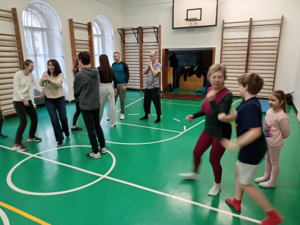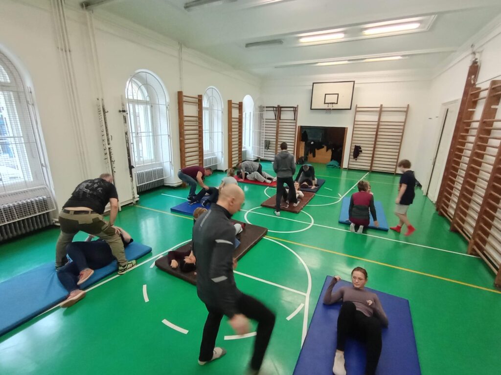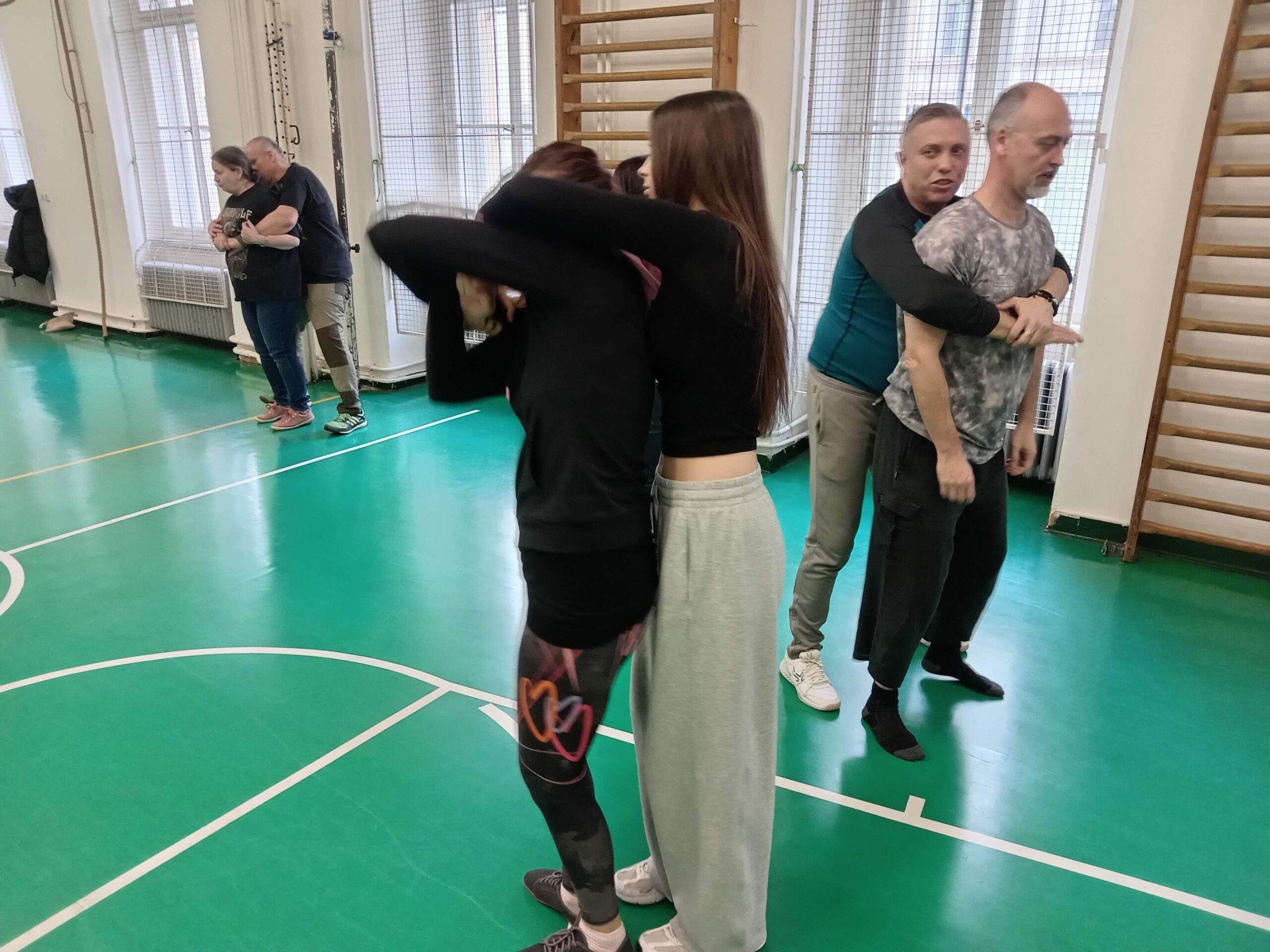 V praktické části si účastníci vyzkoušeli: způsoby vysvobození ze sevření, obranu proti škrcení a principy krytí a pohybu při útoku nožem.